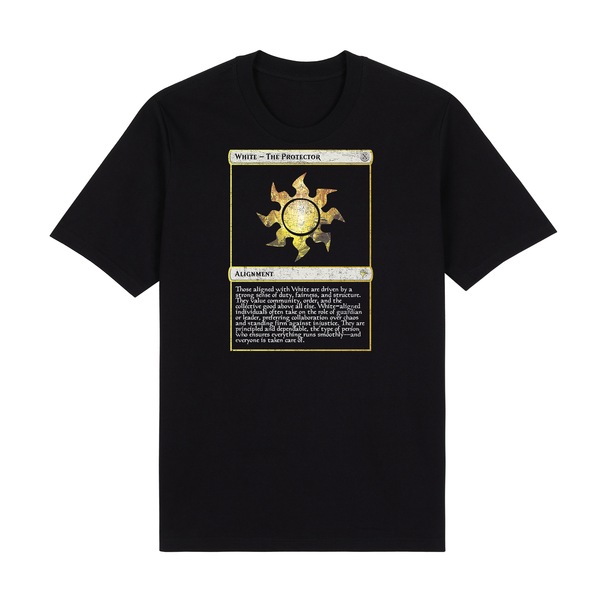 A shirt for those who believe in law, honor, and the power of unity. Featuring the radiant white mana symbol with a lore-inspired alignment that reflects peace through structure and collective strength.