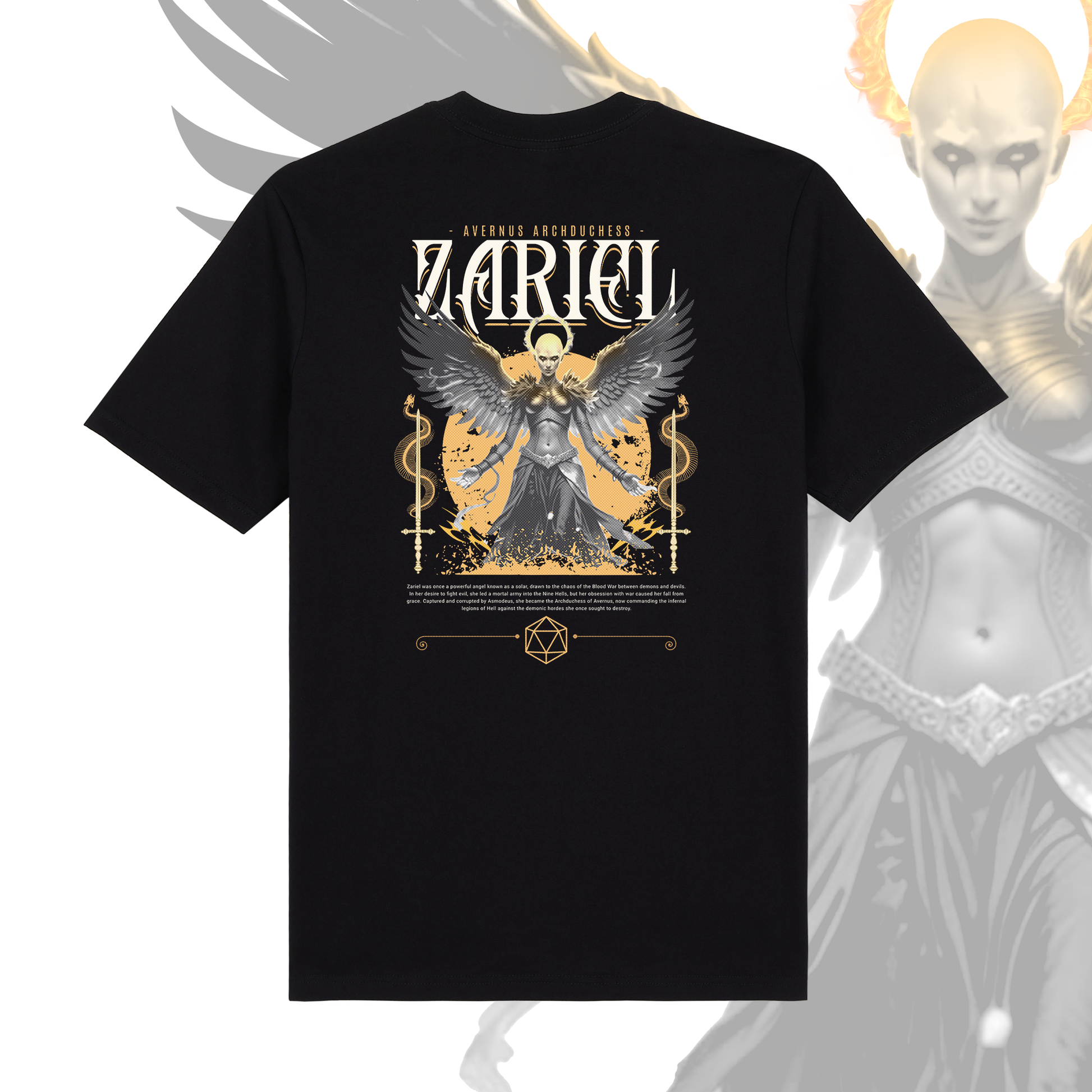 This tee features a full-body illustration of Zariel, the Archduchess of Avernus, styled with gritty streetwear influence and infernal attitude. Wings outstretched, halo blazing, and gaze burning with celestial fury, Zariel commands attention the way she commands legions: without mercy.