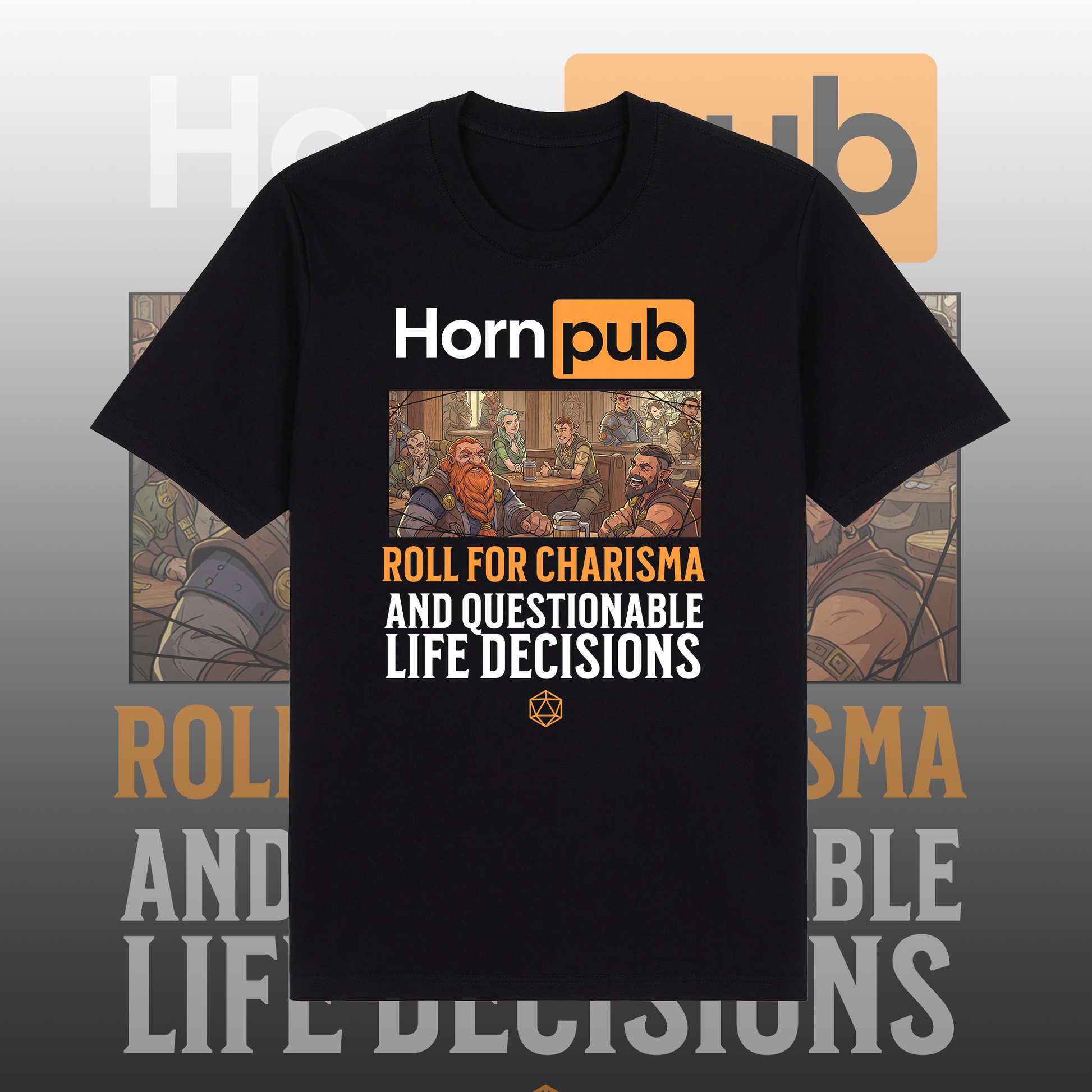 This hilariously inappropriate D&D parody tee takes the ahem legendary layout of a certain adult site and transforms it into the ultimate tavern crawler’s badge of honor. With the bold HornPub logo up top and a crisp vector scene of adventurers partying hard below, it’s the perfect shirt for the bard who rolls with confidence and questionable judgment.