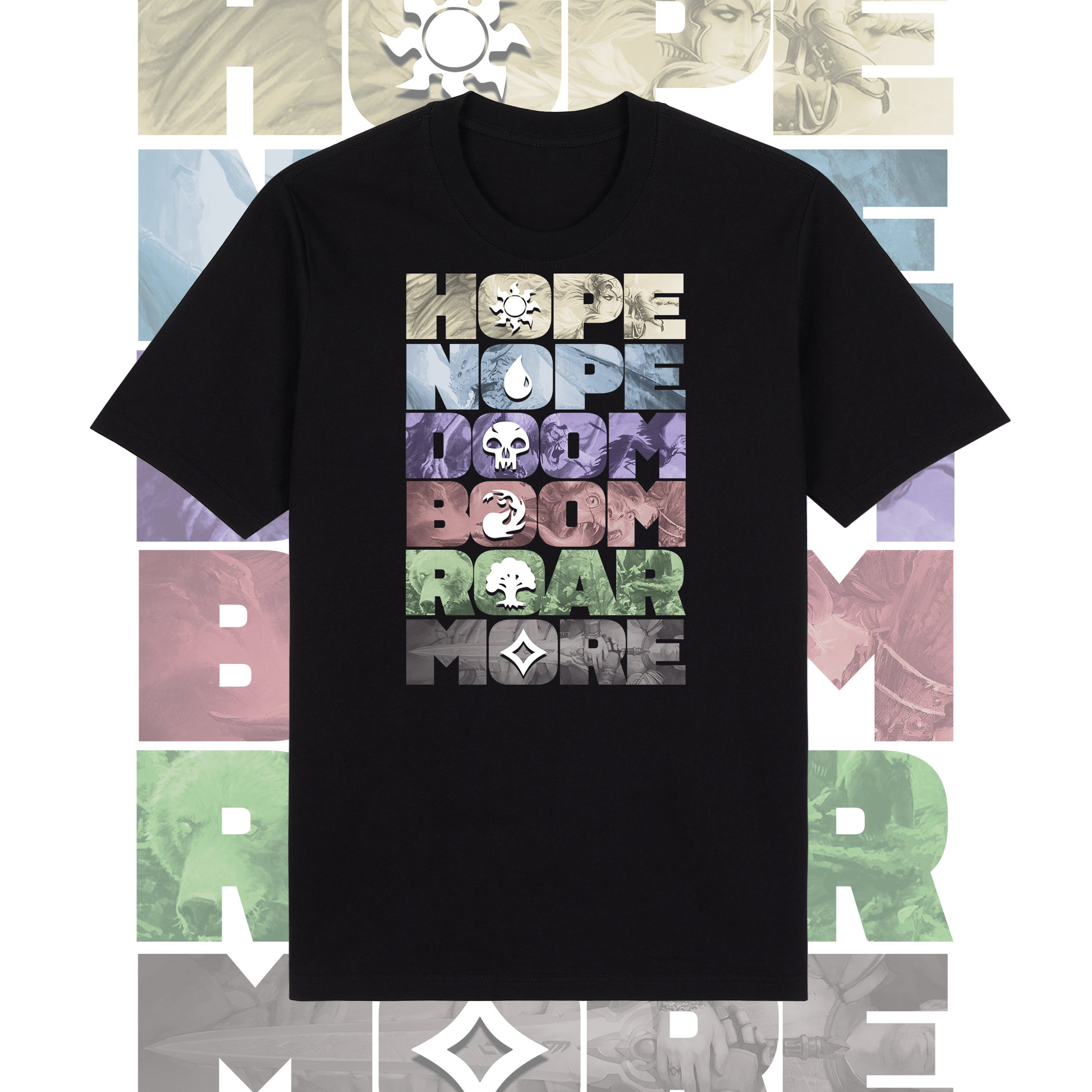 Every spell slinger has a flavor — and this shirt spells it out. Each word is infused with a mana symbol that captures its essence. A tribute to the six colors and the personalities they power.