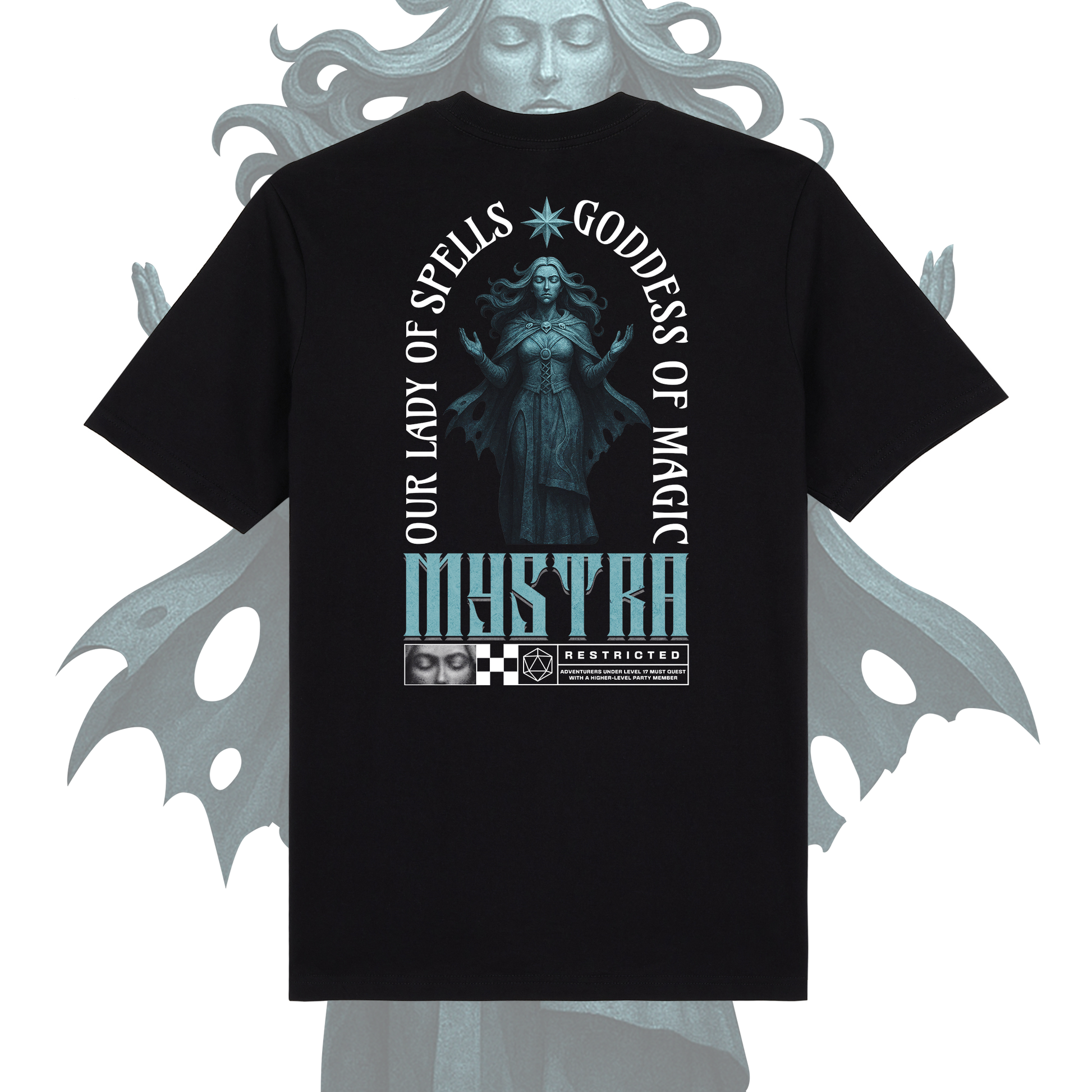 Mystra is the goddess of magic, the Weave, and arcane order—guardian of spellcasters and keeper of balance across the realms. She is the source of all magical energy in the world, both mysterious and omnipresent. This statue-styled design merges divine grace with streetwear boldness, paying tribute to the infinite flow of arcane power.