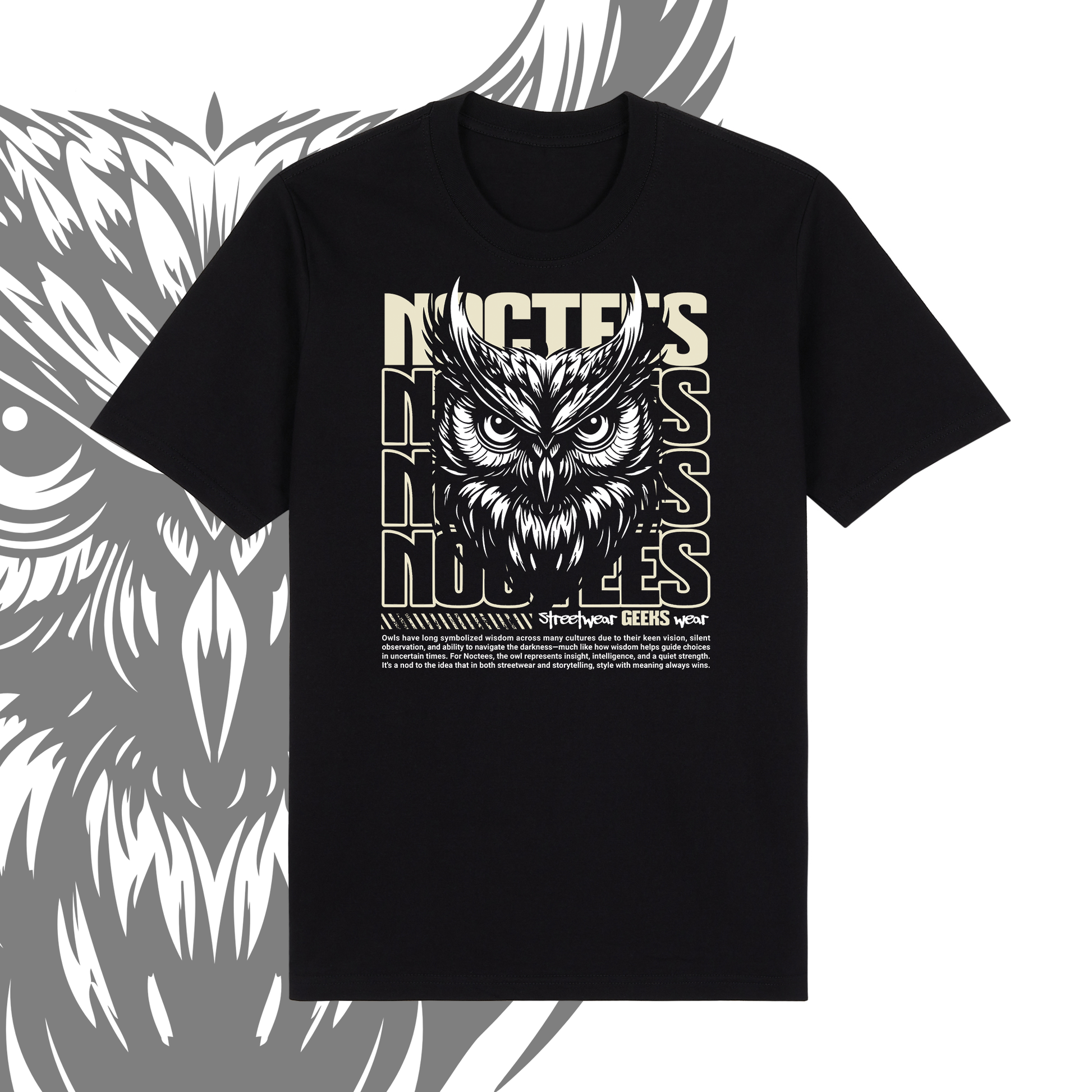 Silent. Sharp. Symbolic. This bold design features an intense owl graphic layered over repeating “NOCTEES” text, paired with the phrase “streetwear GEEKS wear” and a passage about wisdom, silence, and watching the world with discerning eyes. Inspired by the owl as a global symbol of intelligence and mystery, this shirt blends deep lore with urban grit—perfect for those who know knowledge is power, and style is strategy.