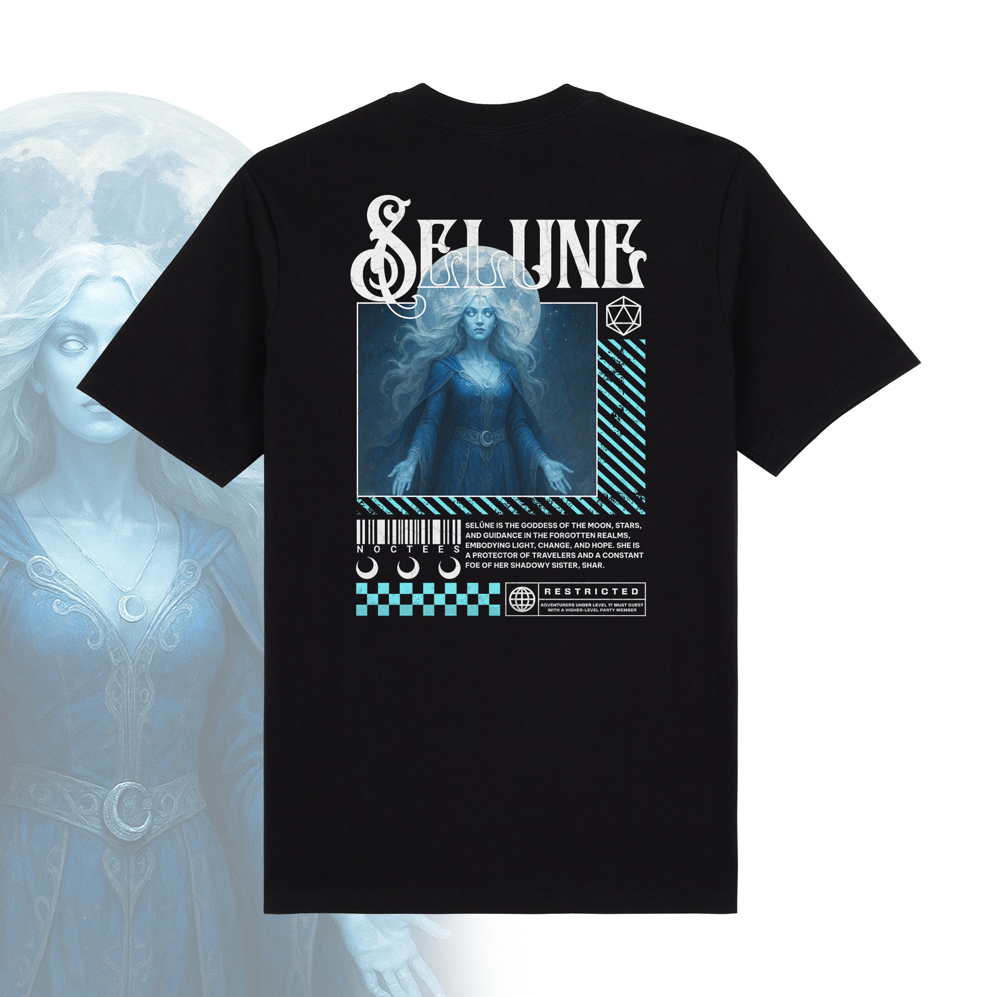 Selûne is the goddess of the moon, guidance, and mystery—protector of wanderers, dreamers, and all who navigate the dark. Sister to Shar and eternal symbol of hope, she shines light where it’s needed most. This design blends celestial elegance with urban grit, channeling her divine presence into wearable art.